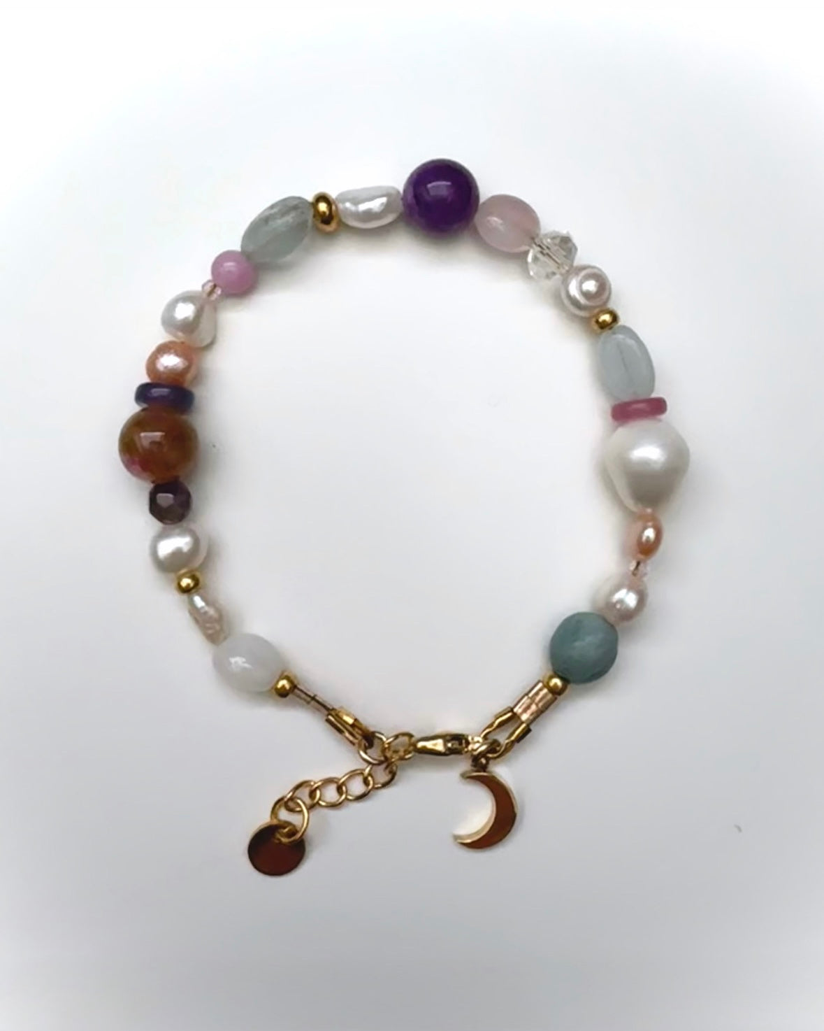Armband aus Süßwasserperlen und Natursteinen 🌙 Mit goldfarbenen Details und Anhängern verziert. Der Verschluss aus vergoldetem Edelstahl ist nickelfrei und rostfrei. ✨