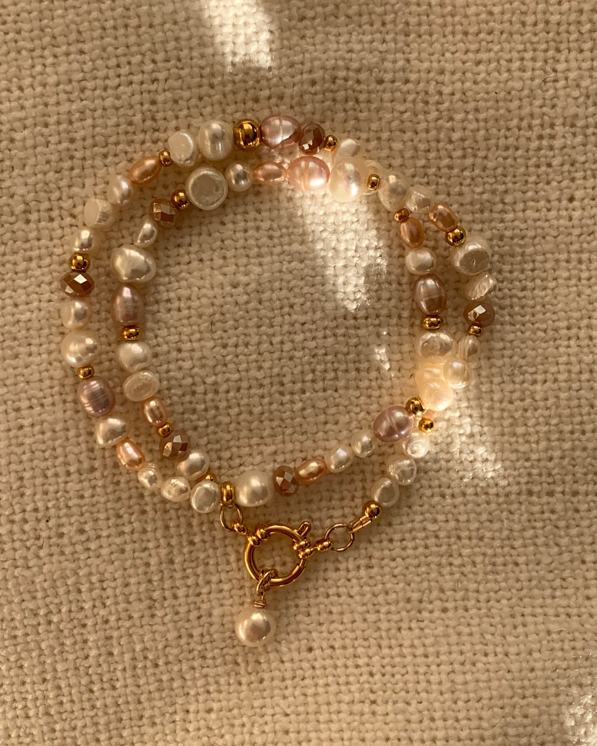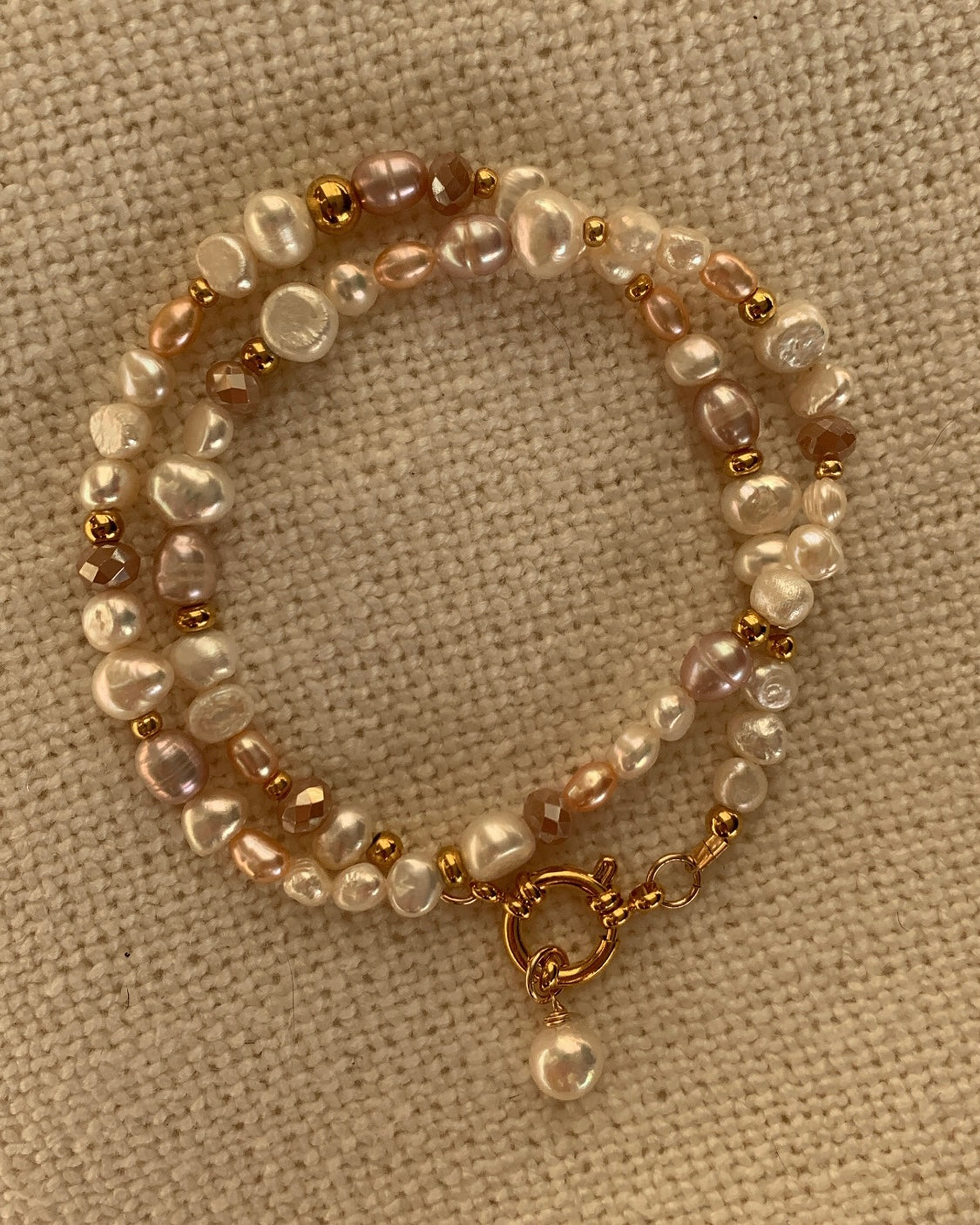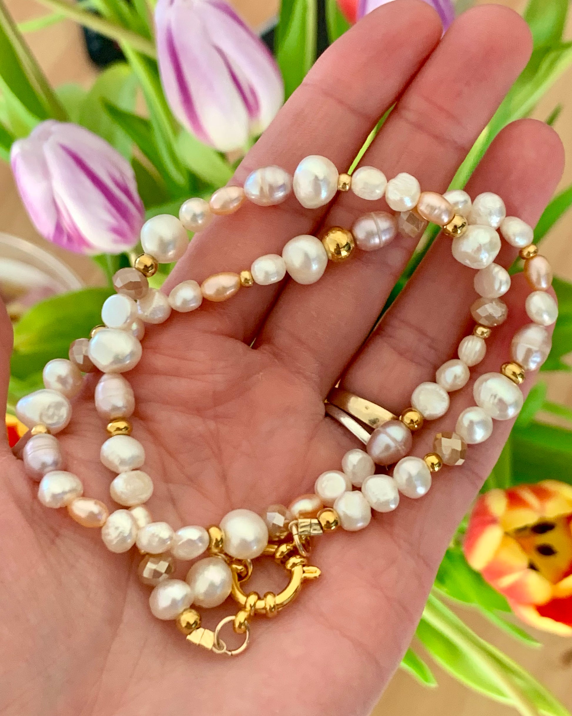 Kette Abrielle hat eine Länge von ca. 42 cm und besteht aus einer Kombination von Süßwasserperlen, Gold-Edelstahlperlen und facettierten Perlen. Die Kette ist mit einem Verschluss aus vergoldetem Edelstahl versehen, der sowohl nickel- als auch rostfrei ist und somit für Allergiker geeignet ist.
