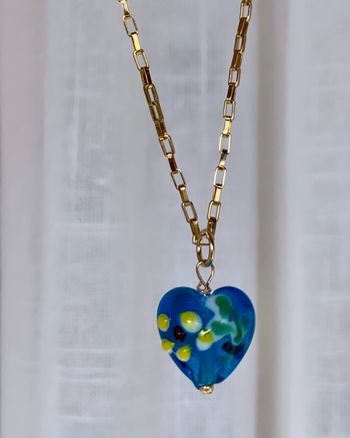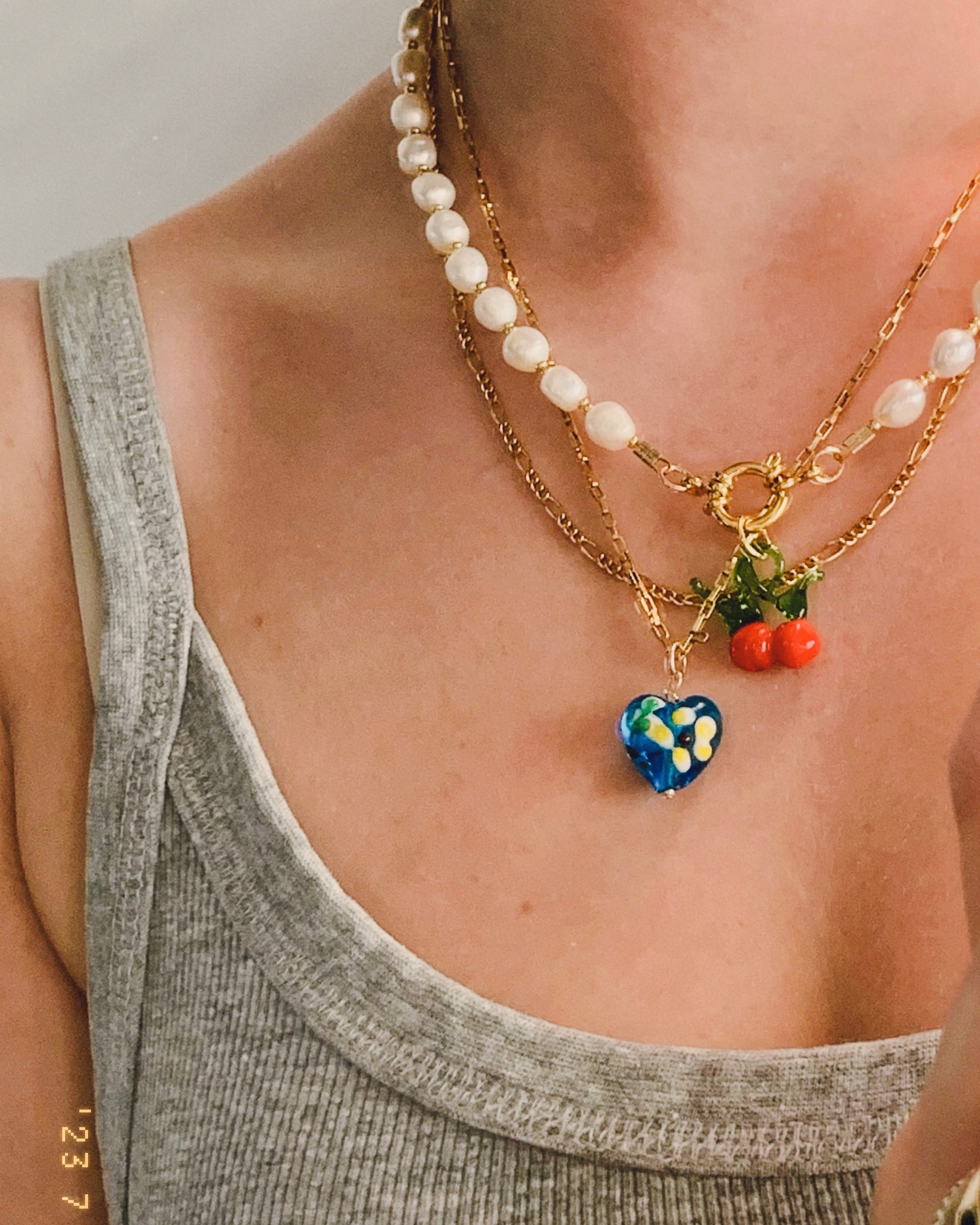Goldene Kette mit Glasperlen Herz Anhänger (handbemalt). Die Kette ist aus rostfreiem Edelstahl und somit wasserfest. Der Verschluss ist 14 Karat Gold Filled. Die Jasina Kette eignet sich perfekt zum kombinieren mit anderen Ketten und funkelt in der Sonne 🌞✨