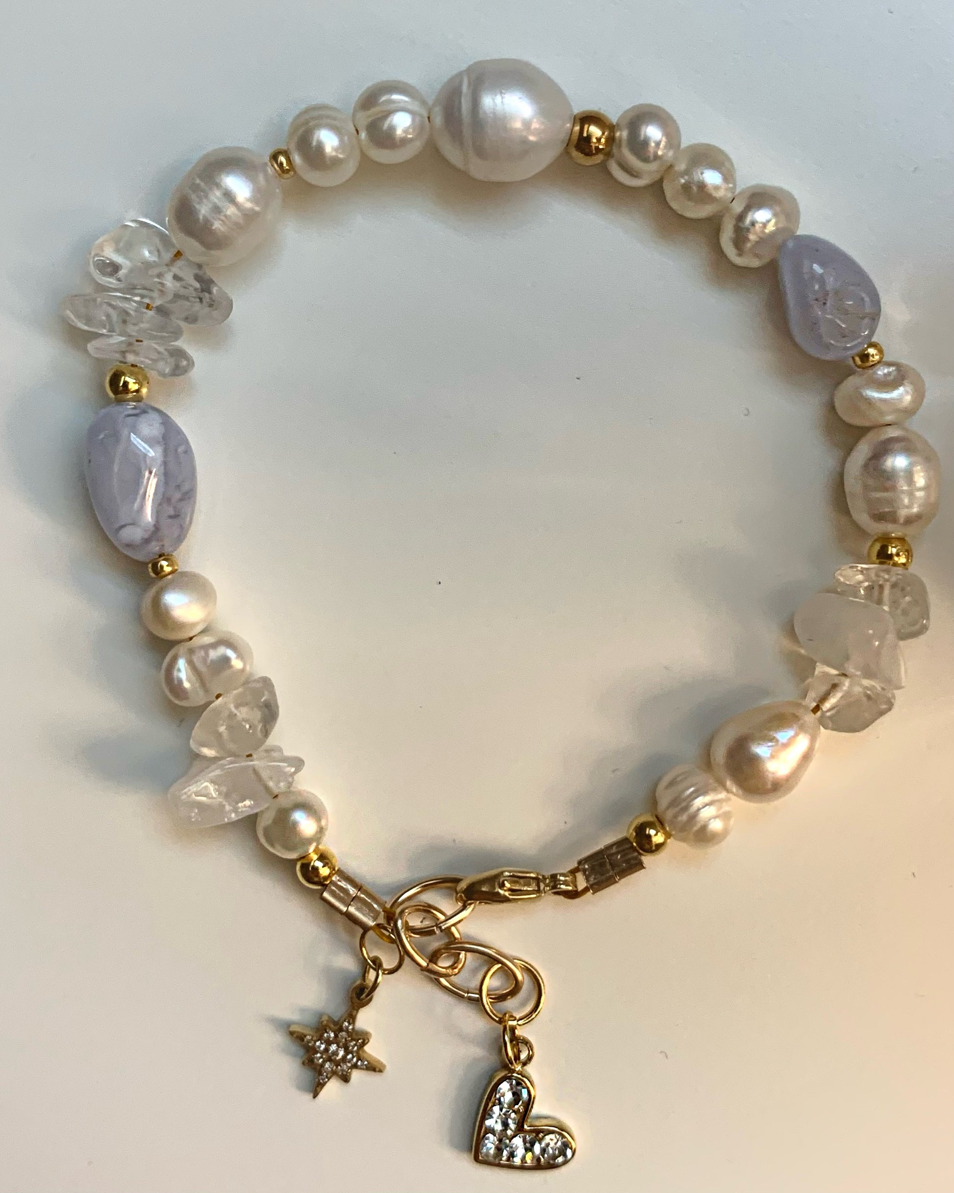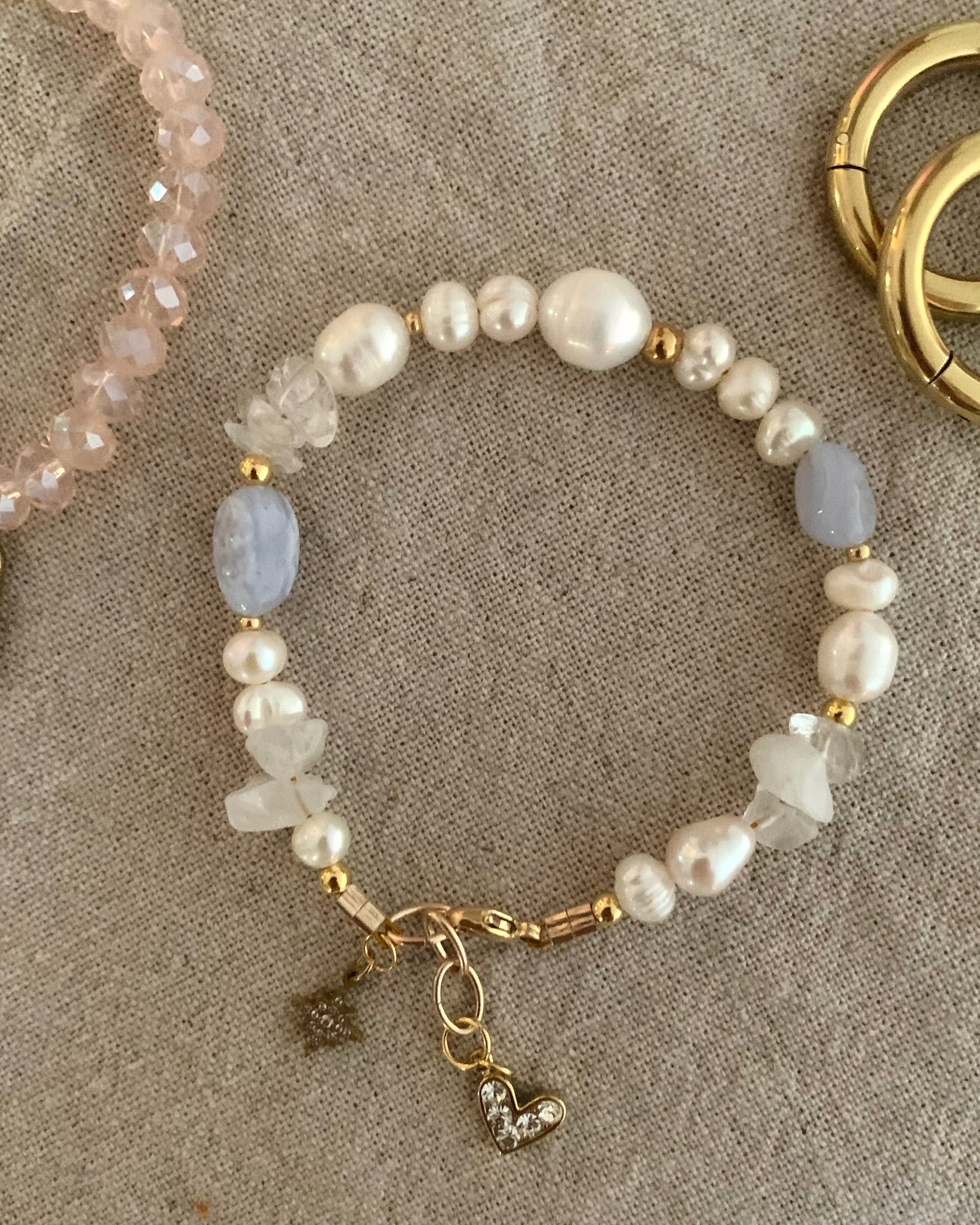 Süßwasserperlen Armband mit Natursteinen und Golddetails. Der Verschluss ist aus hochwertigem 14k Gold filled Material.