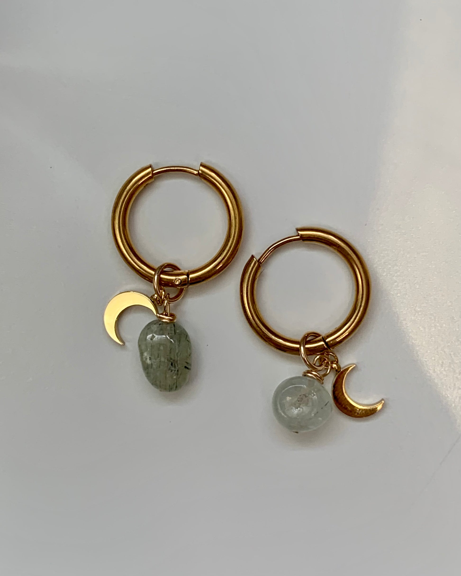 Goldene Creolen mit Mond und Prehnit Edelstein Anhänger 🌜 Hypoallergen, Nickel- und Rostfrei