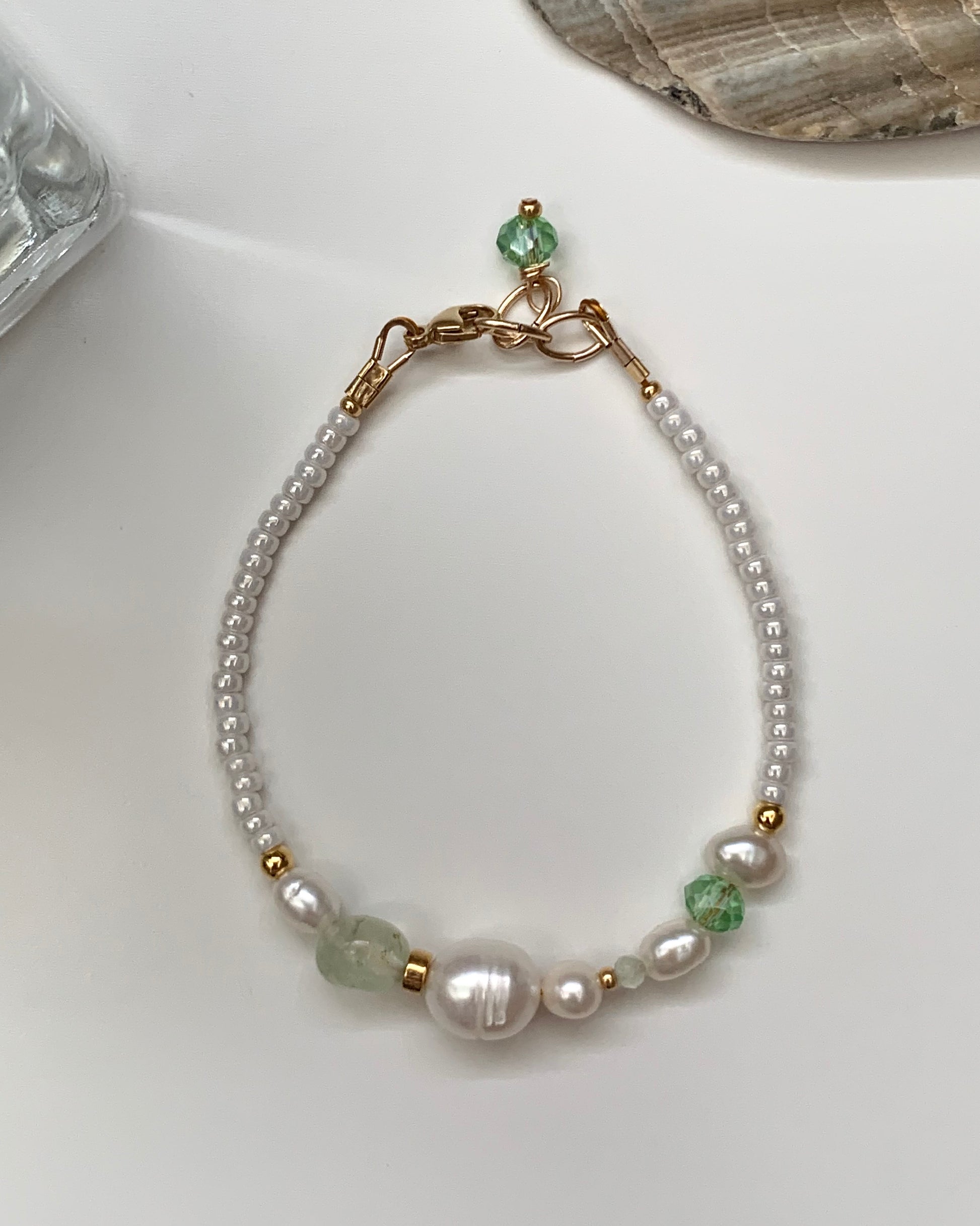 Perlenarmband mit Grün- und Golddetails. Miyuki Perlen, Süßwasserperlen, Stainless Steel Goldperlen, Jade Edelsteinen, Facette Perlen und 14k gold filled Verschluss ✨