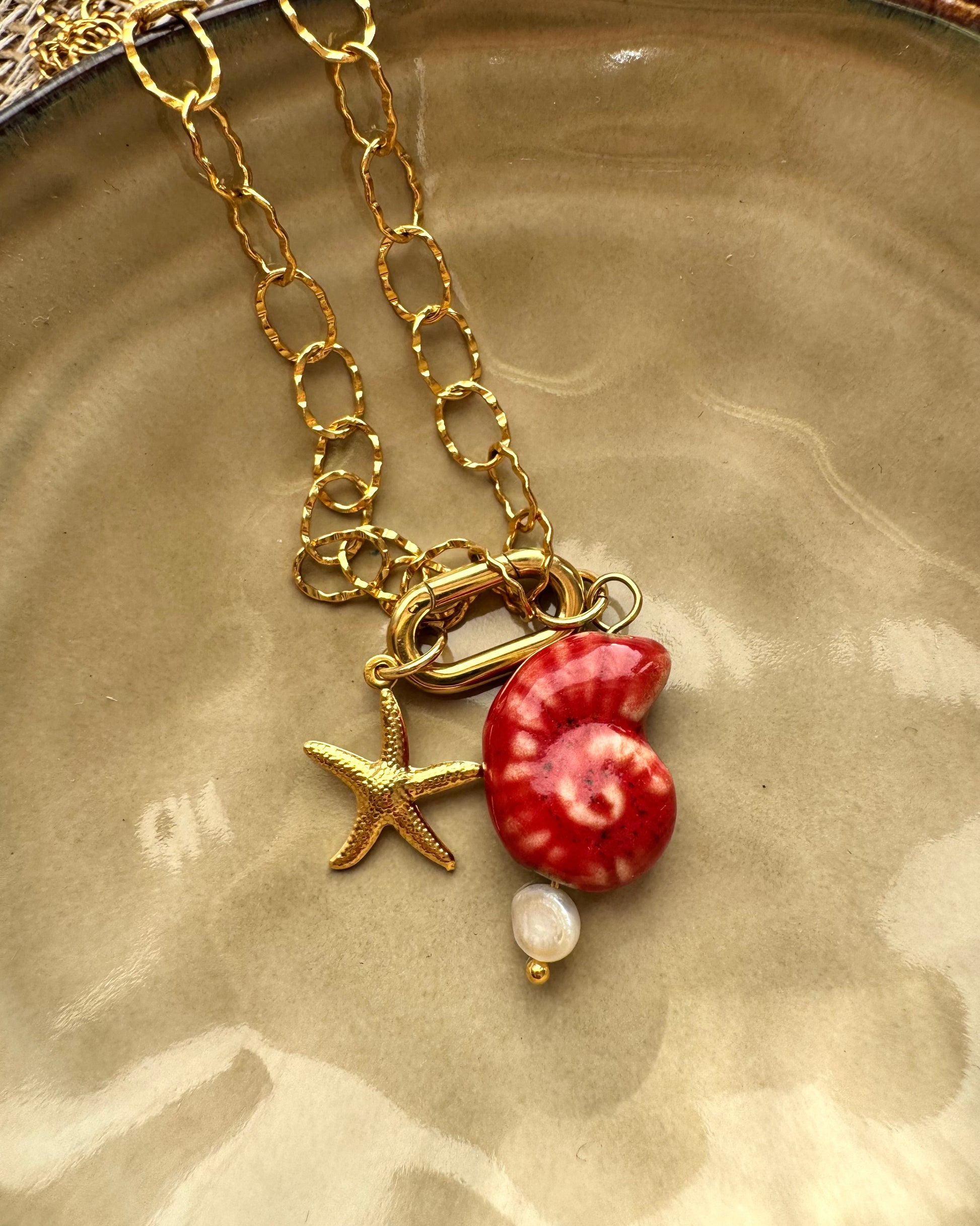 Rote Keramik-Muschel, Süßwasserperle & Seestern aus Stainless Steel – kombiniert an einem eleganten Ringverschluss vorn (ca. 45 cm Länge). Die Anhänger lassen sich beliebig austauschen oder anpassen.